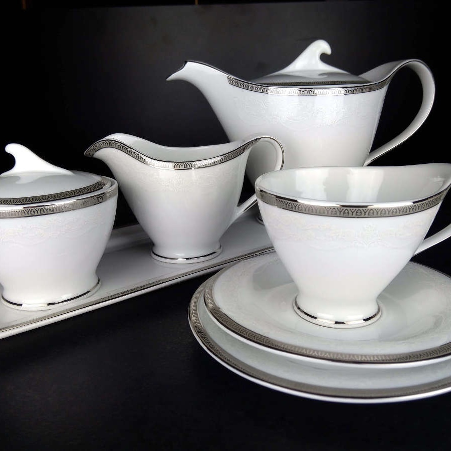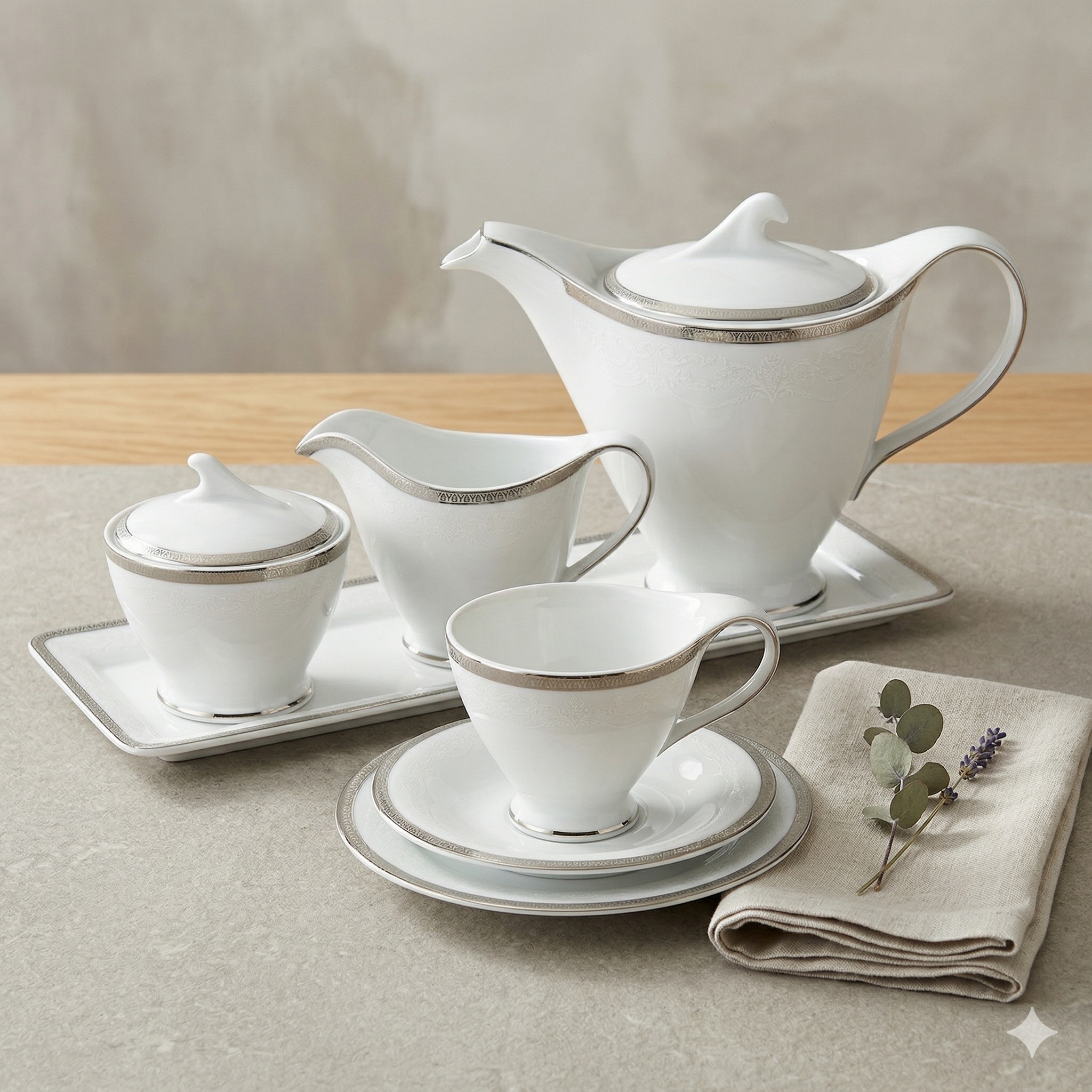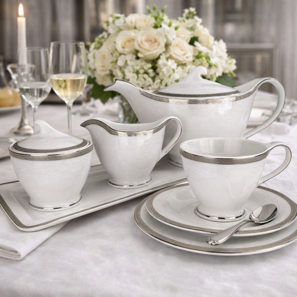 Garnitur do herbaty lub kawy Antonio Platin to jeden z najpiękniejszych wzorów zaprezentowanych przez Porcelanę Bogucice - BGH Network. Piękny serwis z finezyjnie modelowanym kształtem wazy i sosjerki. Wzór w postaci platynowo - białego zdobienia nie pozwala pozostać obojętnym. Serwis Antonio Platin to jeden z produktów cieszących się największą popularnością z oferty BGH Network - Porcelana Bogucice.