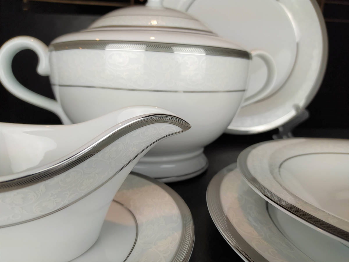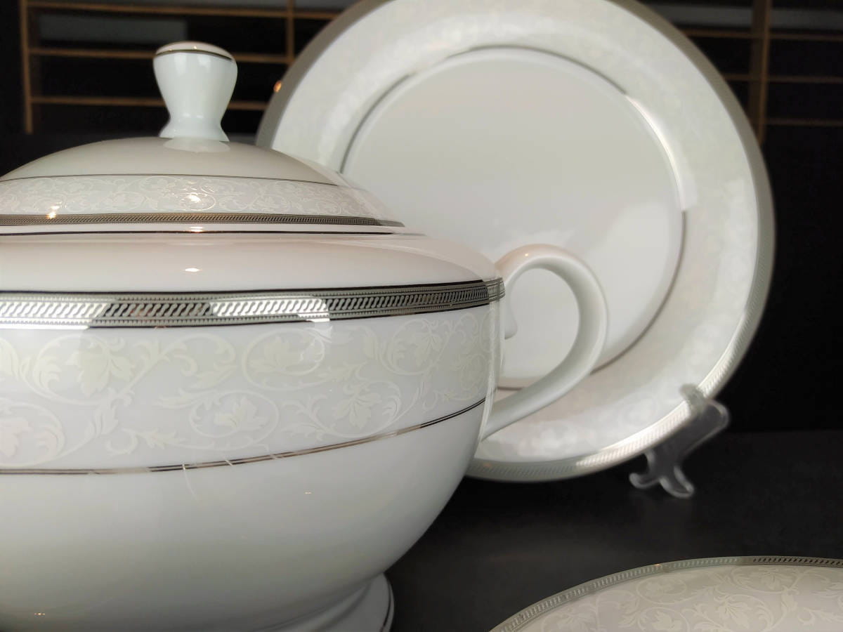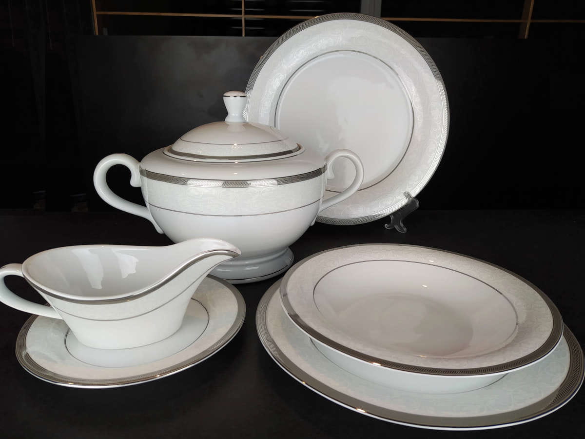 Przepiękna zastawa obiadowa prosto z fabryki w Bogucicach. Klasyczne, eleganckie zdobienie w połączeniu z bardzo ciekawym nowoczesnym fasonem naczyń składa się na doskonale skomponowaną formę w postaci serwisu Geos Platin. Doskonały do uświetnienia nakrycia, komponujący się świetnie z każdym wnętrzem.