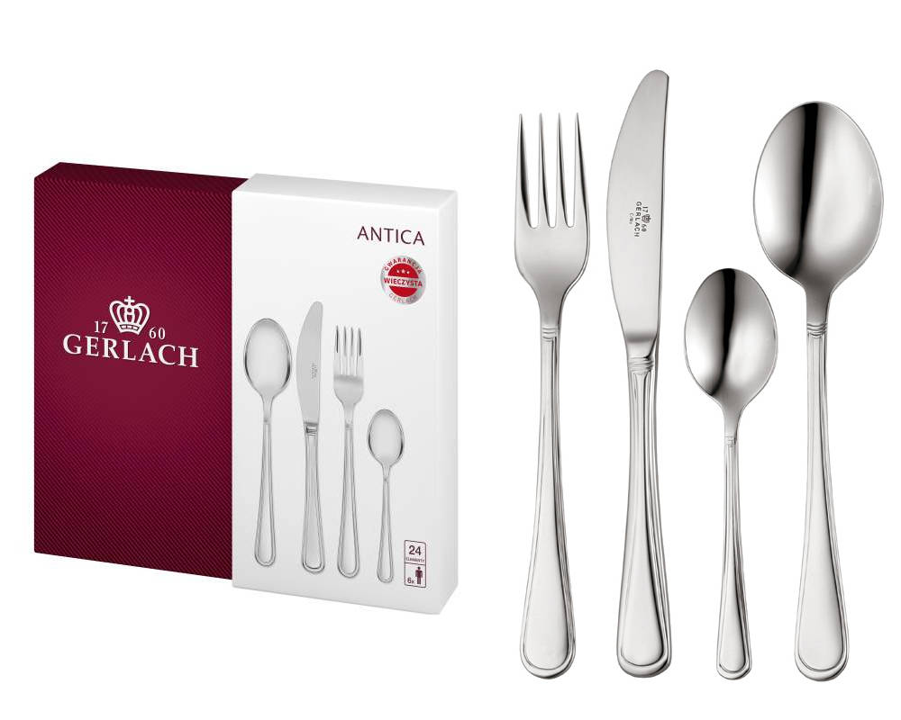 Linia Antica jest jedną z najpopularniejszych linii sztućców firmy Gerlach. Swoją popularność zawdzięcza tradycyjnemu, a zarazem stylowemu wzornictwu oraz przystępnej cenie. Sztućce Antica są doskonałym wyborem dla ceniących prostotę, elegancję i delikatne piękno. Wieczysta gwarancja oraz wykonanie z najszlachetniejszej stali powodują, że Antica to sztuciec cieszący się ogromną popularnością.