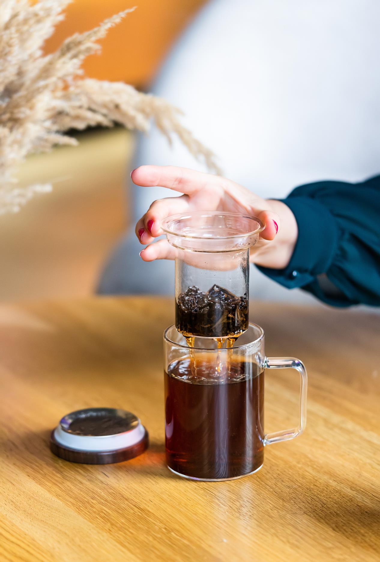 Zatrzymuje fusy w środku, pozostawiając klarowną herbatę w szklance.