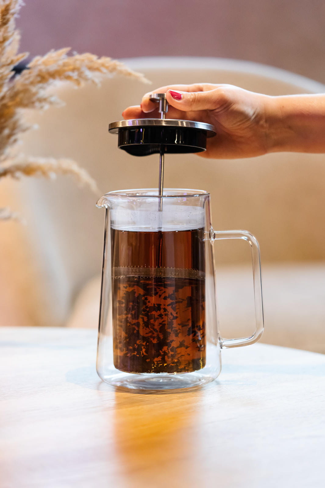 Dzbanek wykonany jest ręcznie z wysokiej jakości szkła borokrzemowego bezpiecznego dla zdrowia i niewchodzącego w kontakt z zawartością oraz niewpływającego na jej smak.