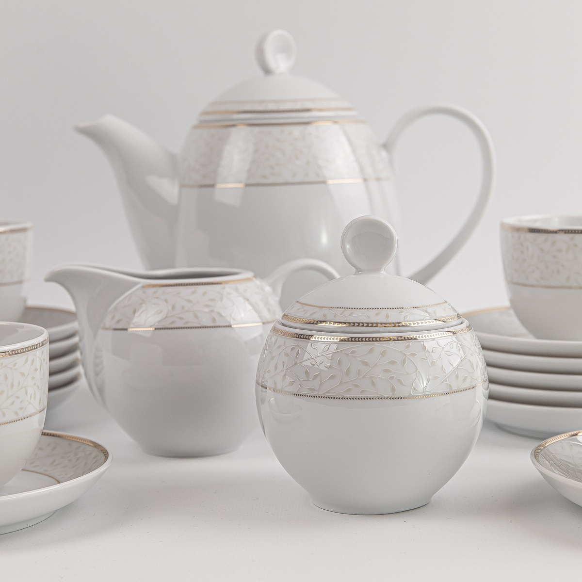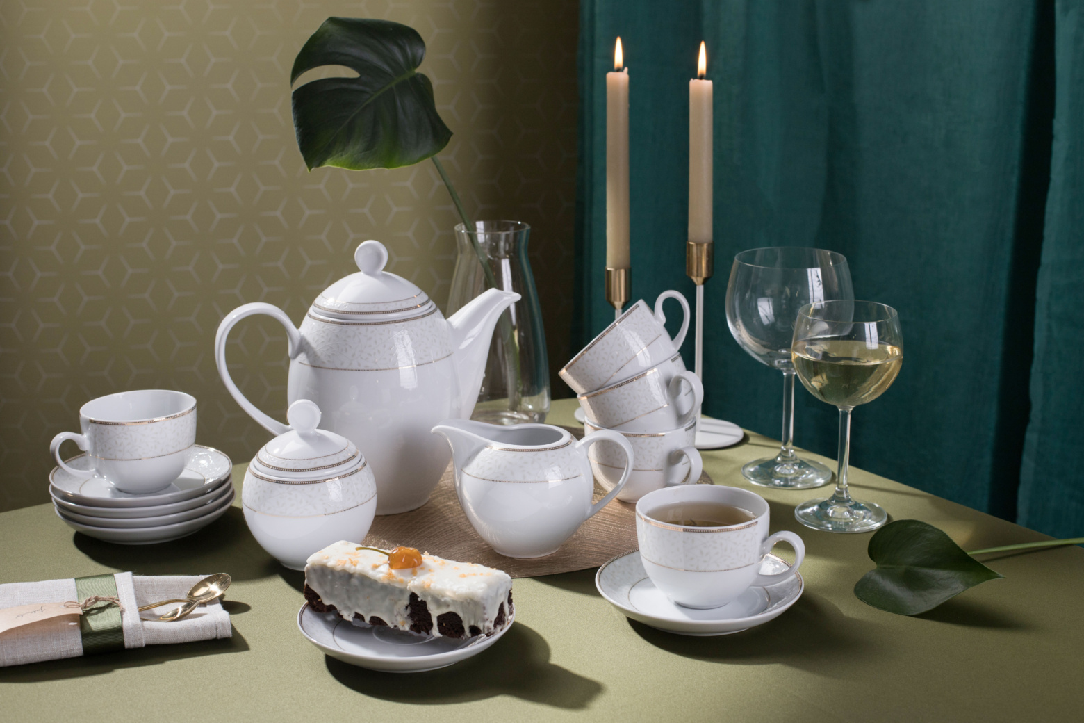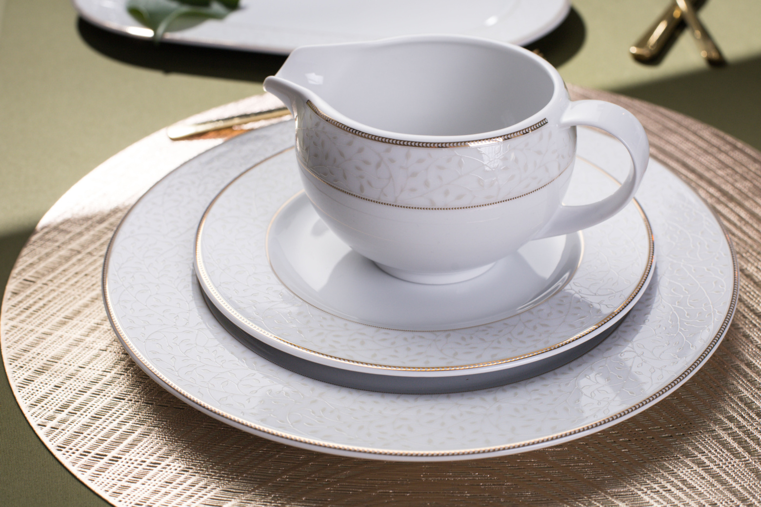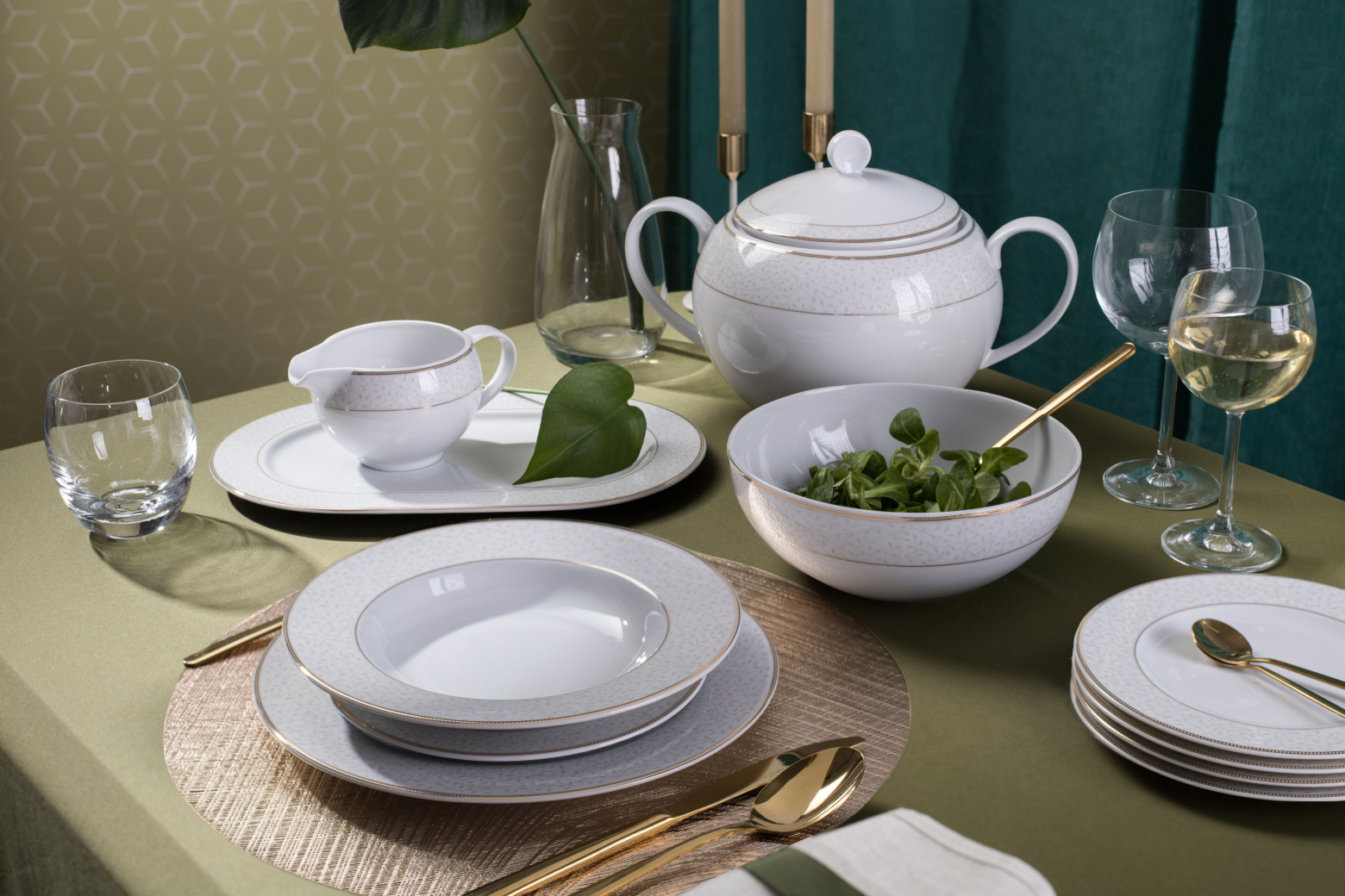 Zoja WA-161 to piękne nakrycie. Biała porcelana z subtelnym złotym zdobieniem daje wrażenie czystości i świeżości. Porcelana ta gwarantuje pięknie nakryty stół zarówno podczas uroczystości jak i codziennych rodzinnych posiłków. Serwis Zoja jest jednym z najnowszych produktów porcelany Waza cieszących się uznaniem klientów. Informujemy, że możliwe jest oczywiście poszerzanie swojego zestawu o dowolne elementy dostosowując go idealnie do własnych potrzeb.